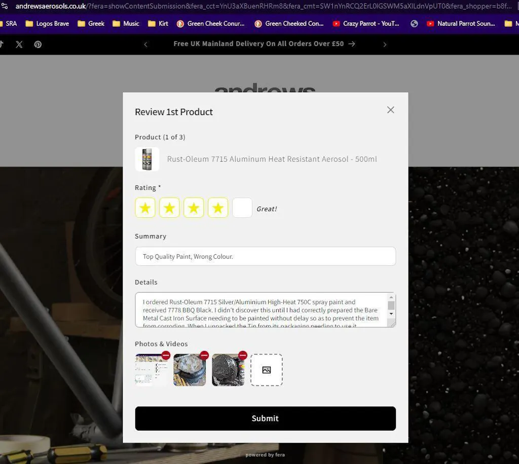 I ordered Rust-Oleum 7715 Silver/Aluminium High-Heat 750C spray paint and received 7778 BBQ Black. I didn't discover this until I had correctly prepared the Bare Metal Cast Iron Surface needing to be painted without delay so as to prevent the item from corroding. When I unpacked the Tin from its packaging needing to use it straight away, I was disappointed to discover that it was not the item I have ordered. Please view images of order invoice and item before and after painting: